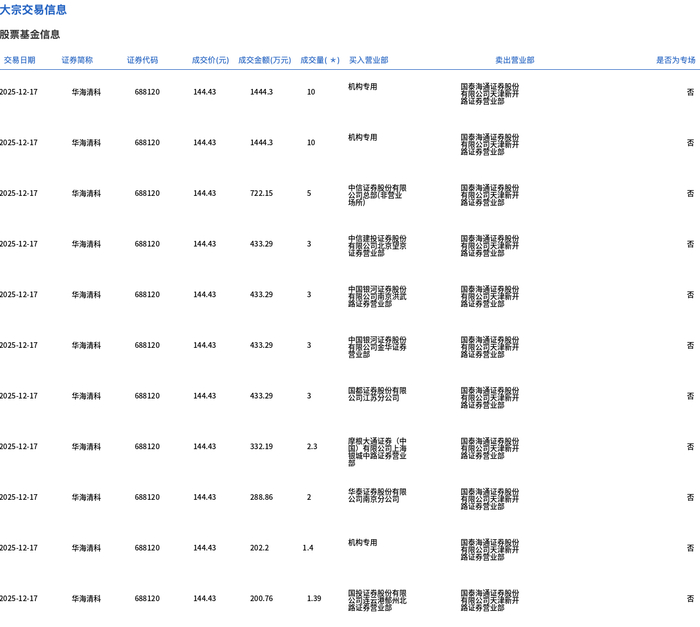 12月17日,华海清科大宗交易成交44.09万股,成交额6367.92万元,占当日总成交额的6.48%,成交价144.43元,较市场收盘价158.96元折价9.14%。