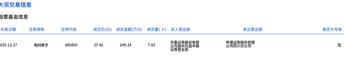 12月17日,电科数字大宗交易成交7.63万股,成交额209.14万元,占当日总成交额的0.19%,成交价27.41元,较市场收盘价28.85元折价4.99%。