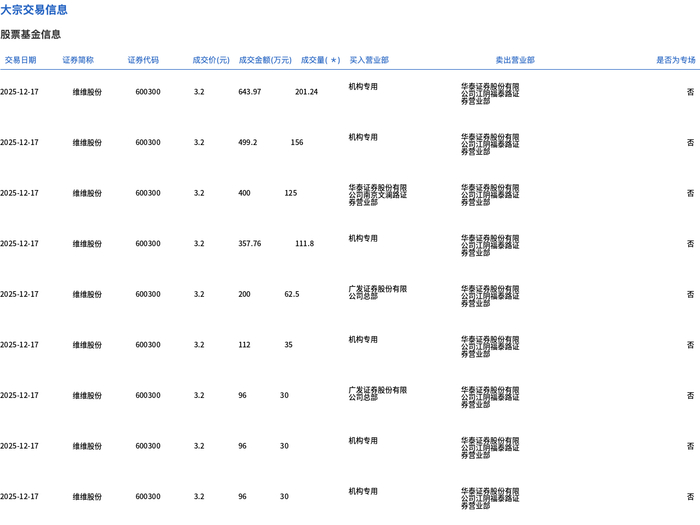 12月17日,维维股份大宗交易成交781.54万股,成交额2500.93万元,占当日总成交额的11.37%,成交价3.2元,较市场收盘价3.58元折价10.61%。