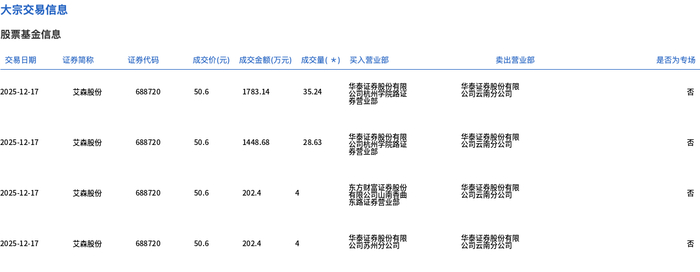 12月17日,艾森股份大宗交易成交71.87万股,成交额3636.62万元,占当日总成交额的7.77%,成交价50.6元,较市场收盘价62.17元折价18.61%。