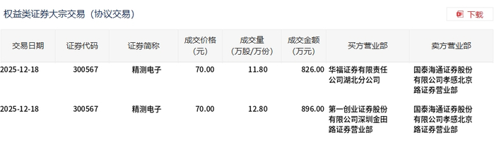 12月18日,精测电子大宗交易成交24.6万股,成交额1722万元,占当日总成交额的3.33%,成交价70元,较市场收盘价76.5元折价8.5%。