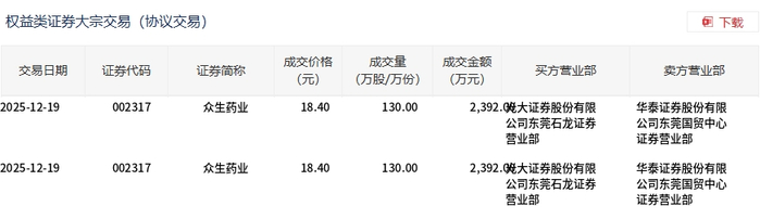 12月19日,众生药业大宗交易成交260万股,成交额4784万元,占当日总成交额的6.41%,成交价18.4元,较市场收盘价19.17元折价4.02%。