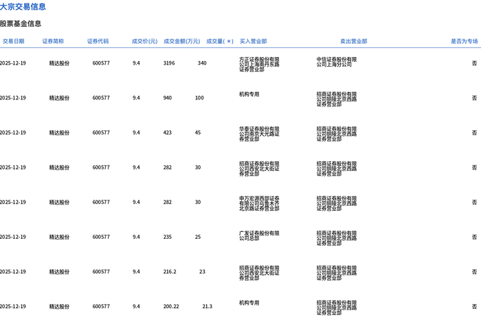 12月19日,精达股份大宗交易成交614.3万股,成交额5774.42万元,占当日总成交额的4.53%,成交价9.4元,较市场收盘价10.83元折价13.2%。