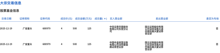 12月19日,广安爱众大宗交易成交250万股,成交额1000万元,占当日总成交额的15.31%,成交价4元,较市场收盘价4.48元折价10.71%。