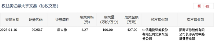 1月16日,唐人神大宗交易成交100万股,成交额427万元,占当日总成交额的4.03%,成交价4.27元,较市场收盘价4.36元折价2.06%。