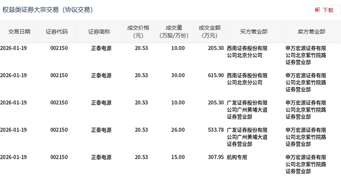 1月19日,正泰电源大宗交易成交91万股,成交额1868.23万元,占当日总成交额的2.83%,成交价20.53元,较市场收盘价22.56元折价9%。
