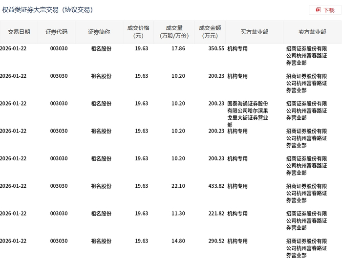 1月22日,祖名股份大宗交易成交106.86万股,成交额2097.63万元,占当日总成交额的34.32%,成交价19.63元,较市场收盘价21.85元折价10.16%。