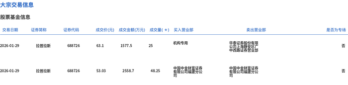 1月29日,拉普拉斯大宗交易成交73.25万股,成交额4136.2万元,占当日总成交额的2.04%,成交均价56.47元,较市场收盘价64.06元折价11.85%,其中最高成交价63.1元,最低成交价53.03元。