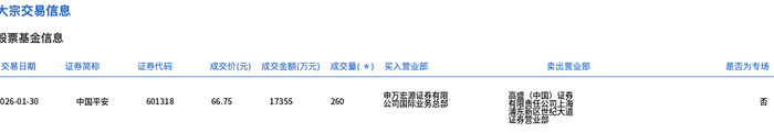 中国平安今日大宗交易平价成交260万股,成交额1.74亿元