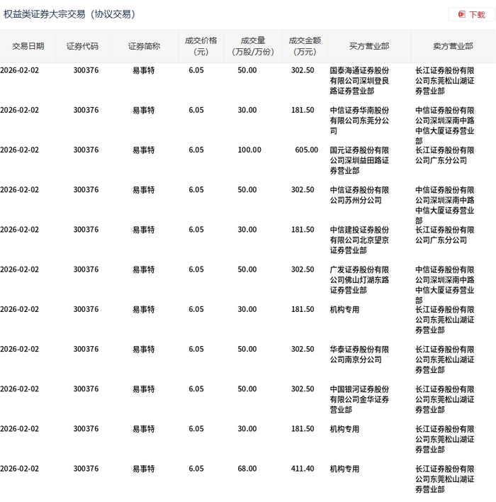 2月2日,易事特大宗交易成交538万股,成交额3254.9万元,占当日总成交额的8.98%,成交价6.05元,较市场收盘价6.83元折价11.42%。