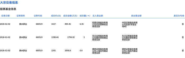 2月2日,贵州茅台大宗交易成交3.15万股,成交额4305.17万元,占当日总成交额的0.35%,成交均价1366.72元,较市场收盘价1427元折价4.22%,其中最高成交价1427元,最低成交价1261元。