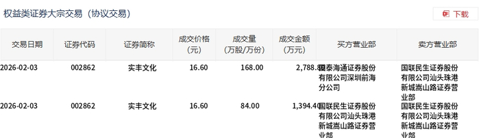 2月3日,实丰文化大宗交易成交252万股,成交额4183.2万元,占当日总成交额的31.85%,成交价16.6元,较市场收盘价18.79元折价11.66%。