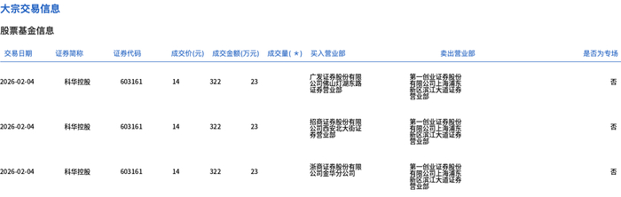 2月4日,科华控股大宗交易成交69万股,成交额966万元,占当日总成交额的6.4%,成交价14元,较市场收盘价15.95元折价12.23%。