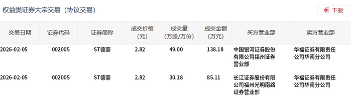 2月5日,ST德豪大宗交易成交79.18万股,成交额223.29万元,占当日总成交额的7.92%,成交价2.82元,较市场收盘价2.92元折价3.42%。