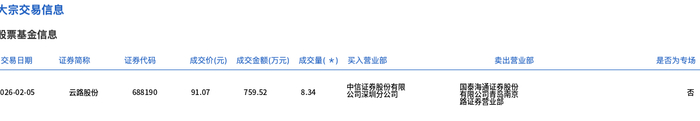 2月5日,云路股份大宗交易成交8.34万股,成交额759.52万元,占当日总成交额的4.66%,成交价91.07元,较市场收盘价98.99元折价8%。