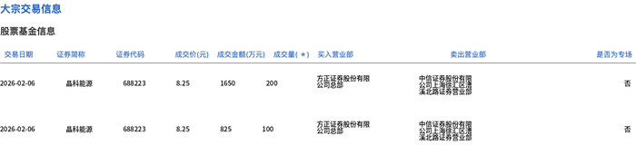 2月6日,晶科能源大宗交易成交300万股,成交额2475万元,占当日总成交额的0.56%,成交价8.25元,较市场收盘价8.33元折价0.96%。