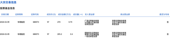 2月9日,毕得医药大宗交易成交8.34万股,成交额475.2万元,占当日总成交额的7.65%,成交价57元,较市场收盘价61.36元折价7.11%。