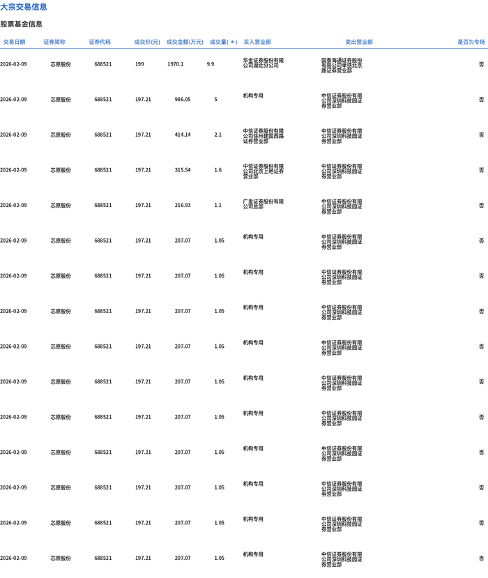 2月9日,芯原股份大宗交易成交30.2万股,成交额5973.46万元,占当日总成交额的1.24%,成交均价197.8元,较市场收盘价220.2元折价10.17%,其中最高成交价199元,最低成交价197.21元。