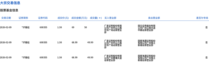 2月9日,*ST精伦大宗交易成交149.98万股,成交额206.98万元,占当日总成交额的34.83%,成交价1.38元,较市场收盘价1.38元持平。