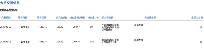 2月9日,国博电子大宗交易成交3.76万股,成交额405.03万元,占当日总成交额的0.76%,成交价107.72元,较市场收盘价121.72元折价11.5%。