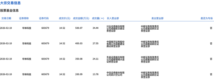 2月10日,华体科技大宗交易成交99.88万股,成交额1450.27万元,占当日总成交额的14.86%,成交价14.52元,较市场收盘价16.35元折价11.19%。