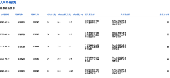 2月10日,福鞍股份大宗交易成交87.79万股,成交额1229万元,占当日总成交额的6.91%,成交价14元,较市场收盘价15.31元折价8.56%。