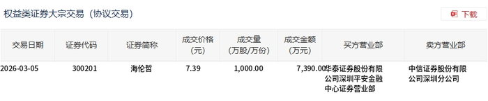 3月5日,海伦哲大宗交易成交1000万股,成交额7390万元,占当日总成交额的8.75%,成交价7.39元,较市场收盘价9.89元折价25.28%。