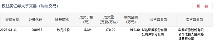 3月11日,欣龙控股大宗交易成交170万股,成交额916.3万元,占当日总成交额的10.87%,成交价5.39元,较市场收盘价5.38元溢价0.19%。