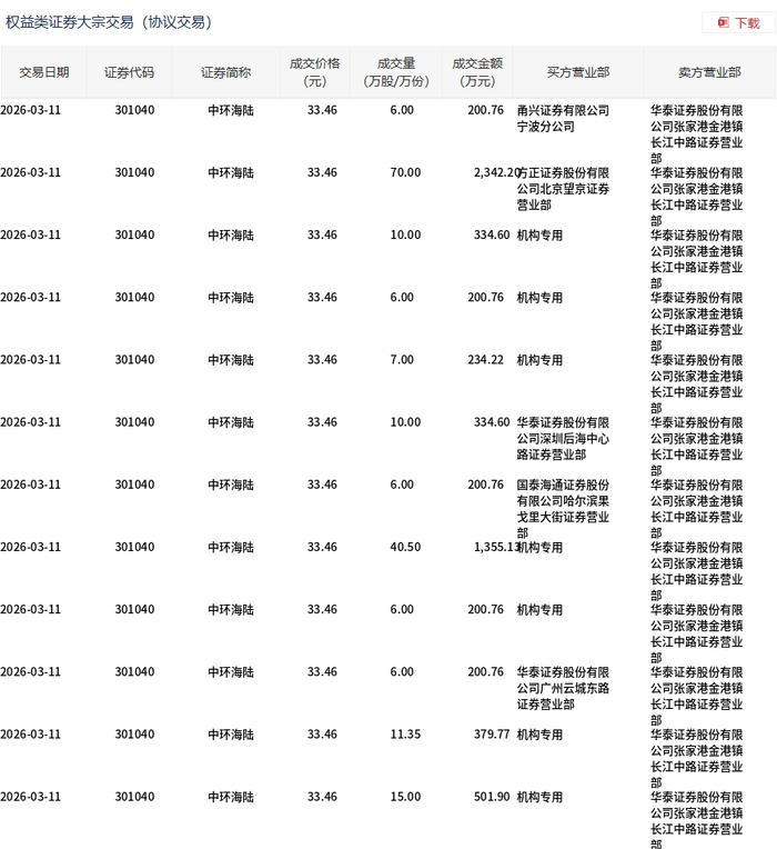 3月11日,中环海陆大宗交易成交193.85万股,成交额6486.22万元,占当日总成交额的10.91%,成交价33.46元,较市场收盘价43.25元折价22.64%。