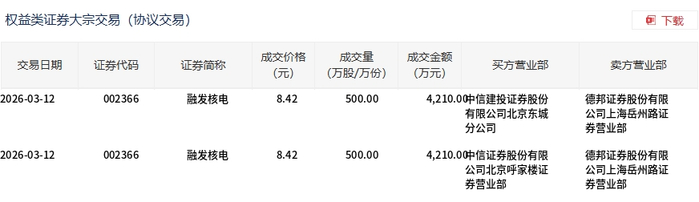 3月12日,融发核电大宗交易成交1000万股,成交额8420万元,占当日总成交额的3.43%,成交价8.42元,较市场收盘价8.63元折价2.43%。