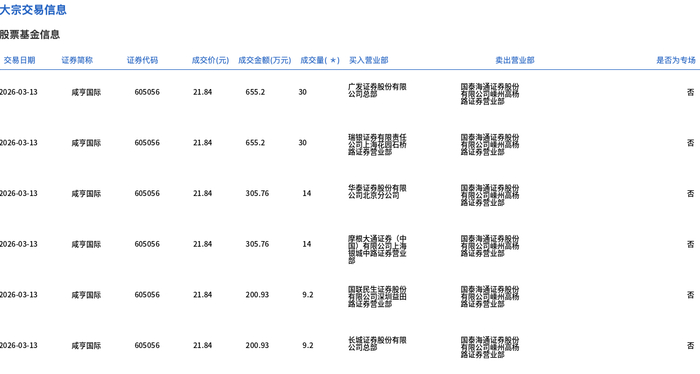 3月13日,咸亨国际大宗交易成交106.4万股,成交额2323.78万元,占当日总成交额的4.88%,成交价21.84元,较市场收盘价24.2元折价9.75%。