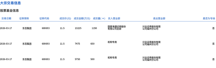3月17日,东百集团大宗交易成交2300万股,成交额2.65亿元,占当日总成交额的43.61%,成交价11.5元,较市场收盘价11.98元折价4.01%。