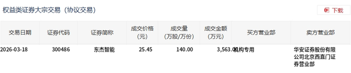 3月18日,东杰智能大宗交易成交140万股,成交额3563万元,占当日总成交额的6.02%,成交价25.45元,较市场收盘价25.97元折价2%。