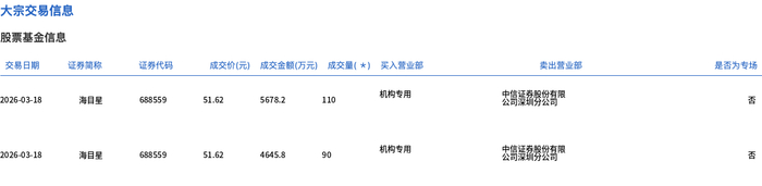 3月18日,海目星大宗交易成交200万股,成交额1.03亿元,占当日总成交额的12.48%,成交价51.62元,较市场收盘价57.35元折价9.99%。