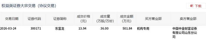 3月24日,东富龙大宗交易成交36万股,成交额501.84万元,占当日总成交额的4.4%,成交价13.94元,较市场收盘价13.94元持平。