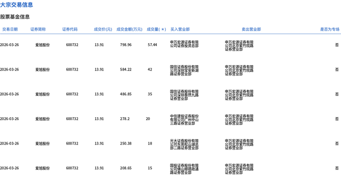 3月26日,爱旭股份大宗交易成交187.44万股,成交额2607.26万元,占当日总成交额的2.24%,成交价13.91元,较市场收盘价14.91元折价6.71%。