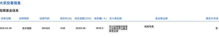 3月30日,京沪高铁大宗交易成交4970.3万股,成交额2.43亿元,占当日总成交额的31.12%,成交价4.88元,较市场收盘价5.07元折价3.75%。