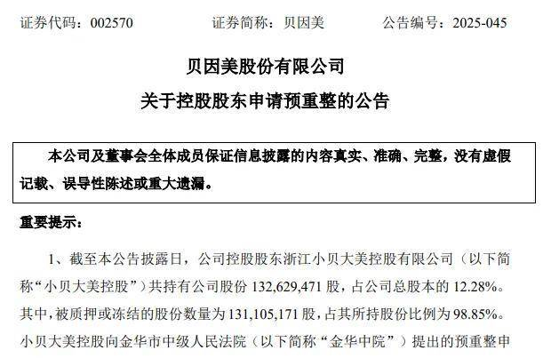 近日,贝因美(002570.SZ)发布公告,其控股股东浙江小贝大美控股有限公司向法院提出的预重整申请迎来进展,浙江省金华市中级人民法院已裁定受理小贝大美控股前期提出的预重整申请,其第一次债权人会议尚在表决过程中。