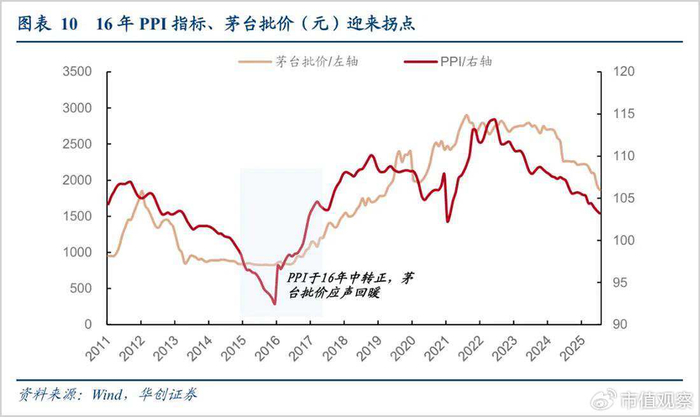 据华创证券研究,以茅台批价和PPI走势进行对比,2016年春节后白酒在二季度批价有所回落,行业仍存在“反弹还是反转”的分歧,但随着年中PPI增速转正,茅台批价从2016年下半年起震荡走高并于年底站上千元,随后头部酒企利润表开始好转,正式标志着新一轮周期开启。