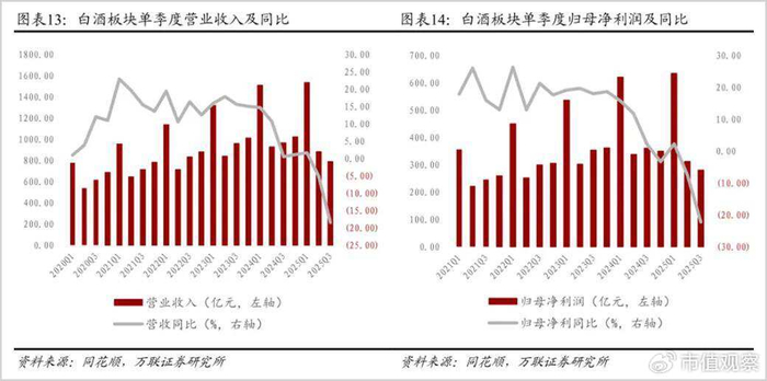 对比次高端和地产酒,次高端表现相对稳健,但在2024年第四季度的收入出现了超过20%的降幅,而地产酒自2024年三季度开始降幅多在10%以上。