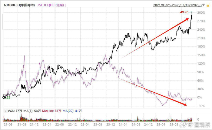 然而,煤炭过去几年涨幅远超预期,光靠业绩中枢上移还不能完全解释。在市值观察看来,更深层原因在于市场交易逻辑出现根本性转变。