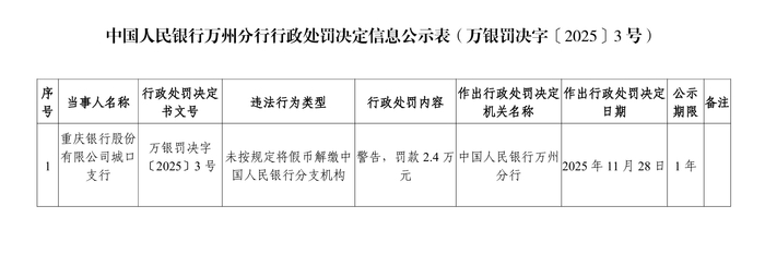 根据行政处罚决定书,重庆银行股份有限公司城口支行存在未按规定将假币解缴中国人民银行分支机构的违法行为,中国人民银行万州分行依据相关法律法规,对重庆银行城口支行作出行政处罚决定,处以警告并罚款2.4万元。