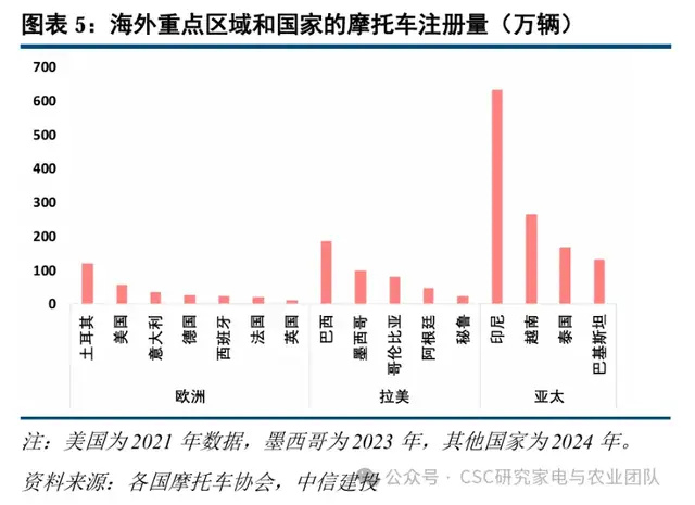 中信建投数据显示,2024年全球摩托车销量达6000万辆,摩托车主要市场集中在亚太、拉美和欧美。