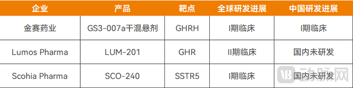 全球范围内,还有Lumos Pharma的LUM-20采用了相似的技术路线,LUM-201作为生长激素促分泌素受体(GHSR)激动剂,其两项Ⅱ期临床研究均达到主要终点和次要终点,验证了对PGHD的治疗效果。