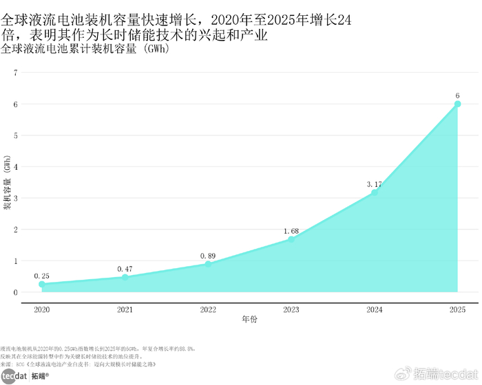 全球液流电池累计装机容量从2025年的6GWh增长至2030年的50GWh,年复合增长率53%,其中中国占比超60%,成为全球液流电池产业核心市场。增长动力来自电网长时储能需求(新能源消纳、电网调频)和技术突破(电解液循环效率提升至95%),预计2027年后将进入GW级装机爆发期。全球液流电池累计装机容量堆叠面积图表6数据EXCEL及图表PDF模板已分享到会员群