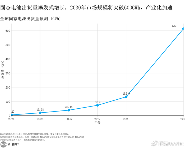 全球固态电池出货量将从2025年的19.68GWh飙升至2030年的614.1GWh,年复合增长率高达82%,增速远超传统锂电池。这一爆发式增长背后,是全固态电池技术成熟(2027年小规模量产)、车企装车需求(2026-2027年头部车企陆续落地)、政策支持三重驱动,预计2028年后将进入规模化应用期,成为动力电池高端化的核心选择。全球固态电池出货量预测折线图表2数据EXCEL及图表PDF模板已分享到会员群