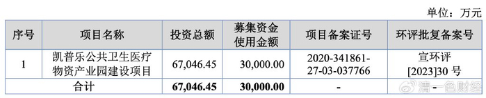 2023年6月12日,宣城市生态环境局发布的《关于安徽凯普乐医疗科技有限公司宣城公共卫生医疗物资产业园环境影响报告表的批复》显示,项目分两期建设:一期项目年产OTC产品系列、IPA、PVP等系列产品186,800万包(片/支),医用敷料4,800万包(片/件),医用器械灭菌服务18万立方米,医用防水垫12,000万个;二期项目年产婴儿及成人纸尿裤1亿片,功能性卫生巾5亿片,功能性不干胶及医用膜500万米。