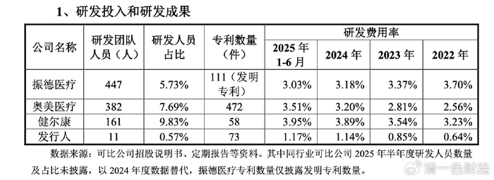 低毛利率的背后是低研发。招股书(上会稿)显示,报告期内,爱舍伦的研发费用率分别为0.64%、0.85%、1.14%和1.17%,而奥美医疗、振德医疗、健尔康的研发费用率均值分别为3.16%、3.24%、 3.42%和3.50%。