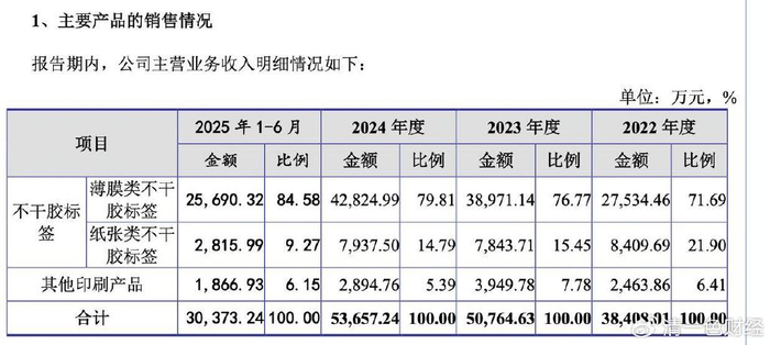 招股书(上会稿)显示,报告期内,江天科技超九成的主营业务收入来自薄膜类不干胶标签、以及纸张类不干胶标签。