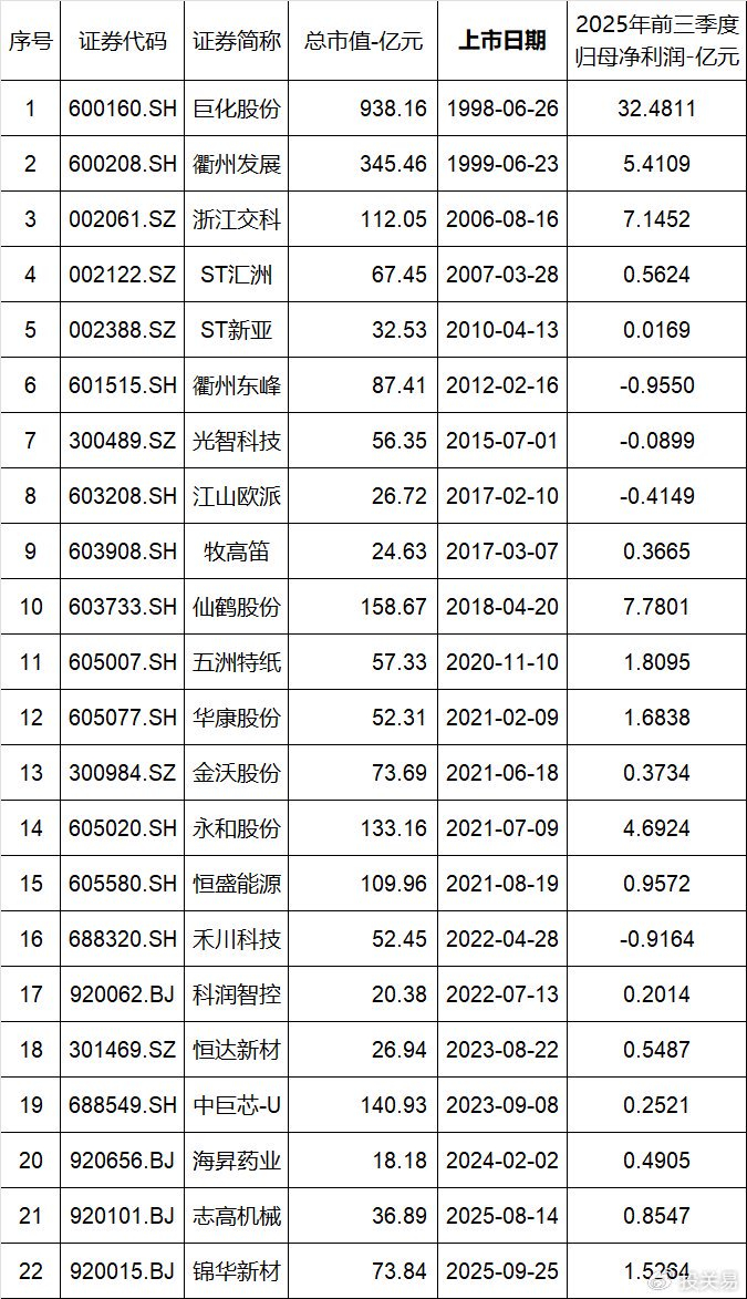 衢州22家上市公司基本信息如下(根据上市日期排序):